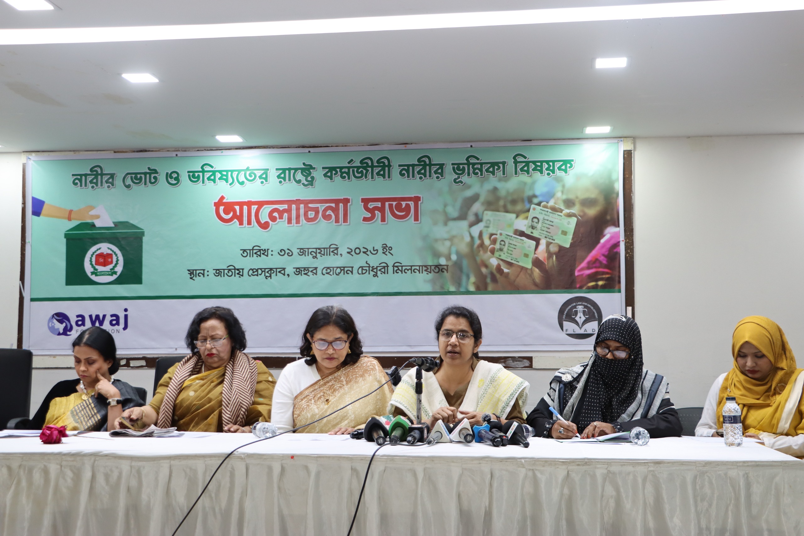 আজ ৩১ জানুয়ারী ২০২৬, দুপুর ৩:টায় জাতীয় প্রেস ক্লাবে “নারীর ভোট ও ভবিষ্যতে রাষ্ট্রে কর্মজীবী নারীর ভূমিকা” শীর্ষক এক বিশেষ আলোচনা সভার আয়োজন করেছে আওয়াজ ফাউন্ডেশন এবং ফ্ল্যাড (ফাউন্ডেশন ফর ল এন্ড ডেভেলপমেন্ট)। অনুষ্ঠানে আসন্ন নির্বাচনে নারী প্রার্থীর নগণ্য অংশগ্রহণ, নীতিনির্ধারণী পর্যায়ে নারীর ভূমিকা এবং কর্মজীবী নারীদের অধিকার সুরক্ষা নিয়ে বিস্তারিত আলোচনা করা হয়।
