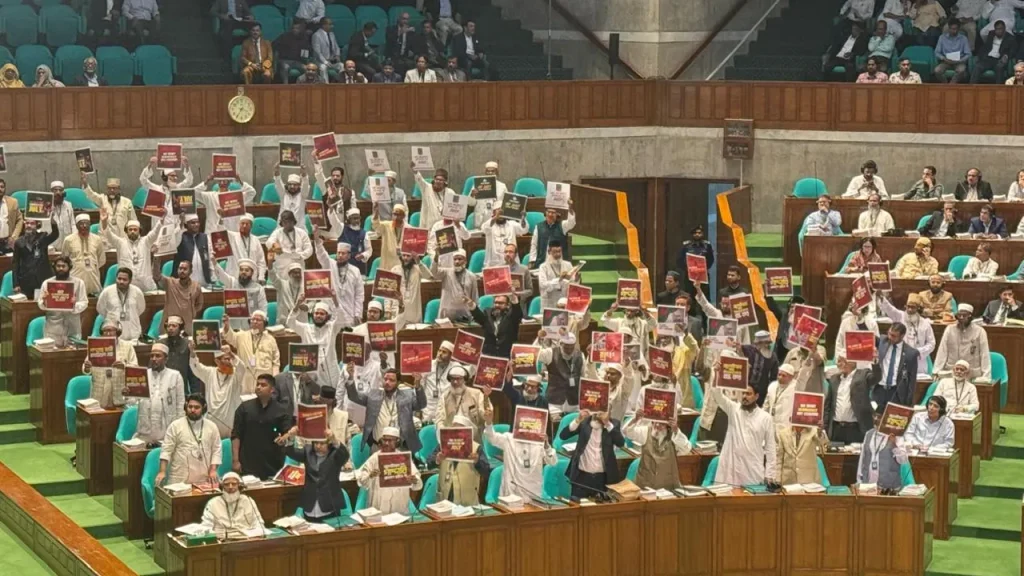 এর আগে রাষ্ট্রপতি মো. সাহাবুদ্দিনকে ভাষণ দেওয়ার জন্য অনুরোধ জানান স্পিকার হাফিজ উদ্দিন। এ সময় বিরোধী দল জামায়াত-এনসিপির সংসদ সদস্যরা দাঁড়িয়ে প্রতিবাদ জানান। এ সময় তাদের হাতে বিভিন্ন প্ল্যাকার্ড দেখা যায়। প্ল্যাকার্ডে জুলাই নিয়ে গাদ্দারি চলবে না, জুলাইয়ের সঙ্গে বিশ্বাস ঘাতকতা বন্ধ করসহ বিভিন্ন স্লোগান লেখা রয়েছে। স্পিকার এ সময় সবাইকে শান্ত থাকতে আহ্বান জানান।