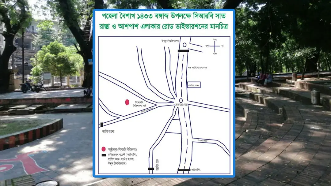 মহানগর পুলিশের পক্ষ থেকে জানানো হয়েছে, বৈশাখের সাংস্কৃতিক অনুষ্ঠান নির্বিঘ্ন করতে নজরুল স্কয়ার (ডিসি হিল) ও সিআরবি শিরিষতলা কেন্দ্রিক বিভিন্ন সড়কে রোড ব্লক বসিয়ে ডাইভারশন দেওয়া হবে।